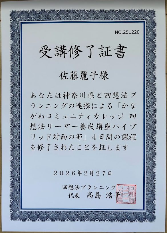 「かながわコミュニティカレッジ 回想法リーダー養成講座(ハイブリッド対面の部)」を修了しました。