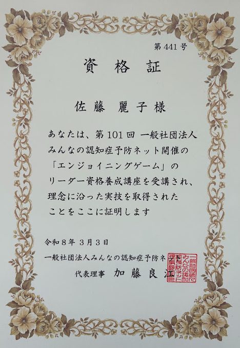 「エンジョイニングゲーム リーダー資格養成講座」を受講し、修了しました。